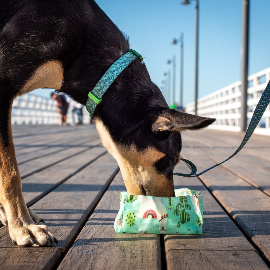 *please note that dog toys and eco bowls may differ from picture depending on stock availability. We will match the dog toys and Eco Bowl with the colour of your collar and leash selection.