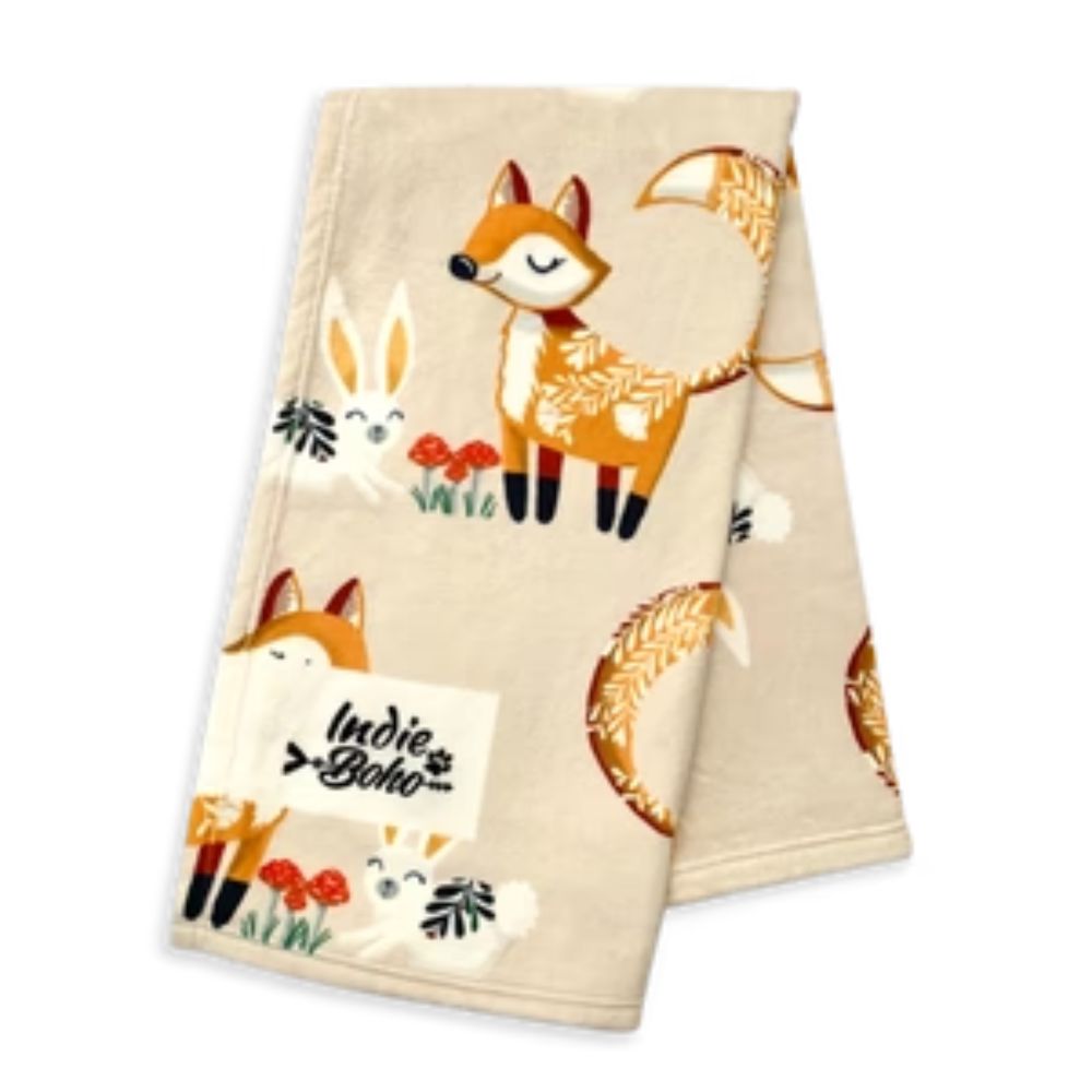 Foxy Tales is our latest design by Australian artist Debi Hudson. The blanket features a fox and rabbit pattern on a cream coloured background.