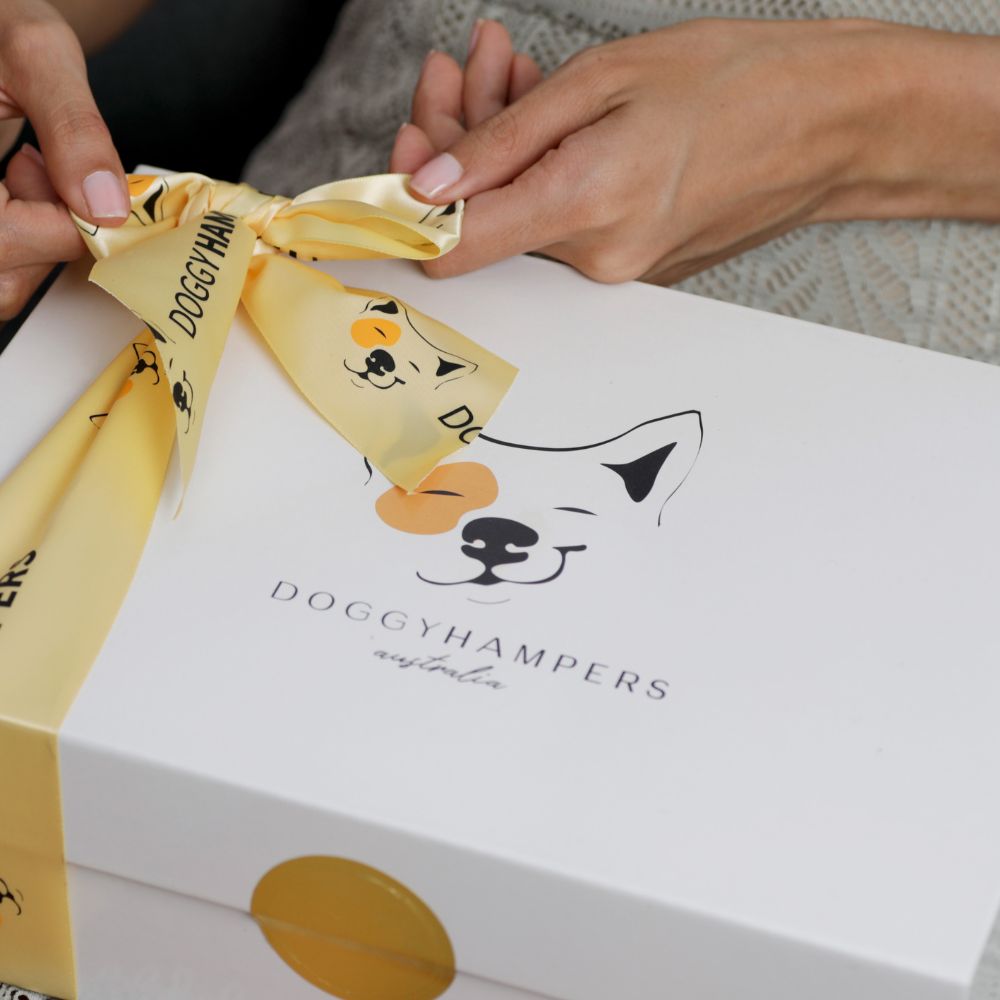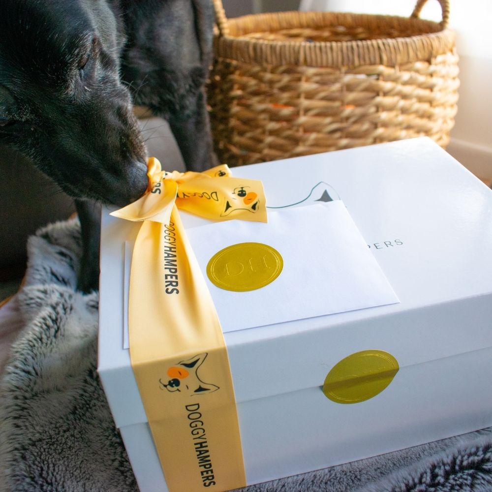 Tissue wrap, wood wool shavings, Doggy Hampers ribbon, gold seal sticker