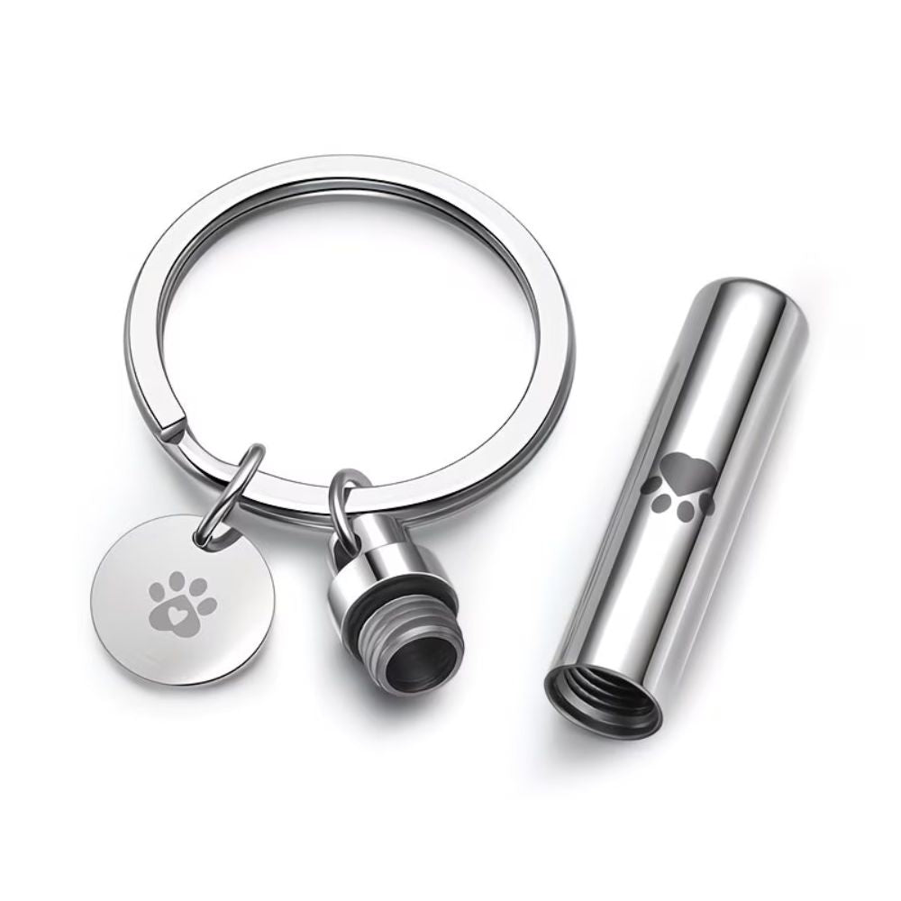 Our Pet Ashes Keepsake Keychain offers a discreet and meaningful way to keep your beloved dog close, wherever life takes you. Designed with a small internal compartment, this blank keepsake allows you to safely store a tiny portion of ashes, fur, or another treasured memento.