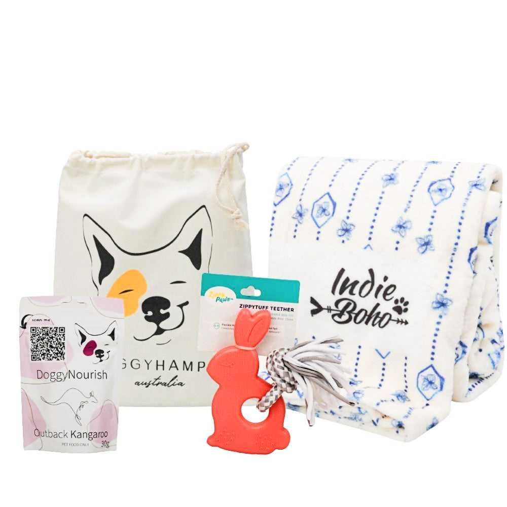 With the Puppy Pack Designer Blanket Dog Toys Australia you can welcome your new BFF home with this exquisite gift bag featuring a luxuriously soft Indie Boho designer blanket (pawfect for snuggling), along with a puppy teether and bag of treats. Your little fur kid will feel right at home with their very own gift bag.